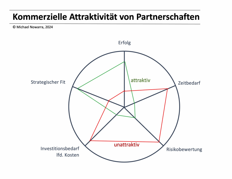 Finanziell lukrativ bedeutet im Channel: relevanter Umsatz (nicht zu gering, aber auch nicht zu hoch) und einen Break-even unter 12 Monaten – und zwar fast aus dem Stand! Kommerziell attraktiv bedeutet: die optimale Ausprägung von fünf verschiedenen Dimensionen. Eine kleine Graphik verdeutlicht das und zeigt ein attraktives und ein unattraktives Profil.